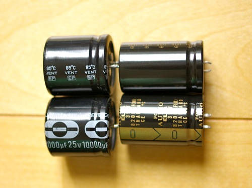 今回のLM3886に対して、電源部はオリジナルのコンデンサーを使用してみたのですが、電源電圧が27Vくらいあるので耐圧を超えてしまいました。オリジナルのA級アンプでは消費電流が大きいのでドロップして24Vになっていたのでしょう。